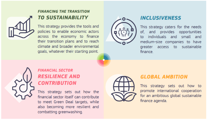 According to Valdis Dombrovskis, Executive Vice-President for an Economy that Works for People, “(…) Today's Sustainable Finance Strategy is key to generate private finance to reach our climate targets and tackle other environmental challenges. We also want to create sustainable funding opportunities for small and medium-sized companies”[5]. The renewed strategy’s purpose is to contribute to the objectives of the European green deal, by creating an enabling framework for private investors and the public sector to facilitate sustainable investments. It aims to redirect private capital flows to green investments and to embed a culture of sustainable corporate governance in the private sector.