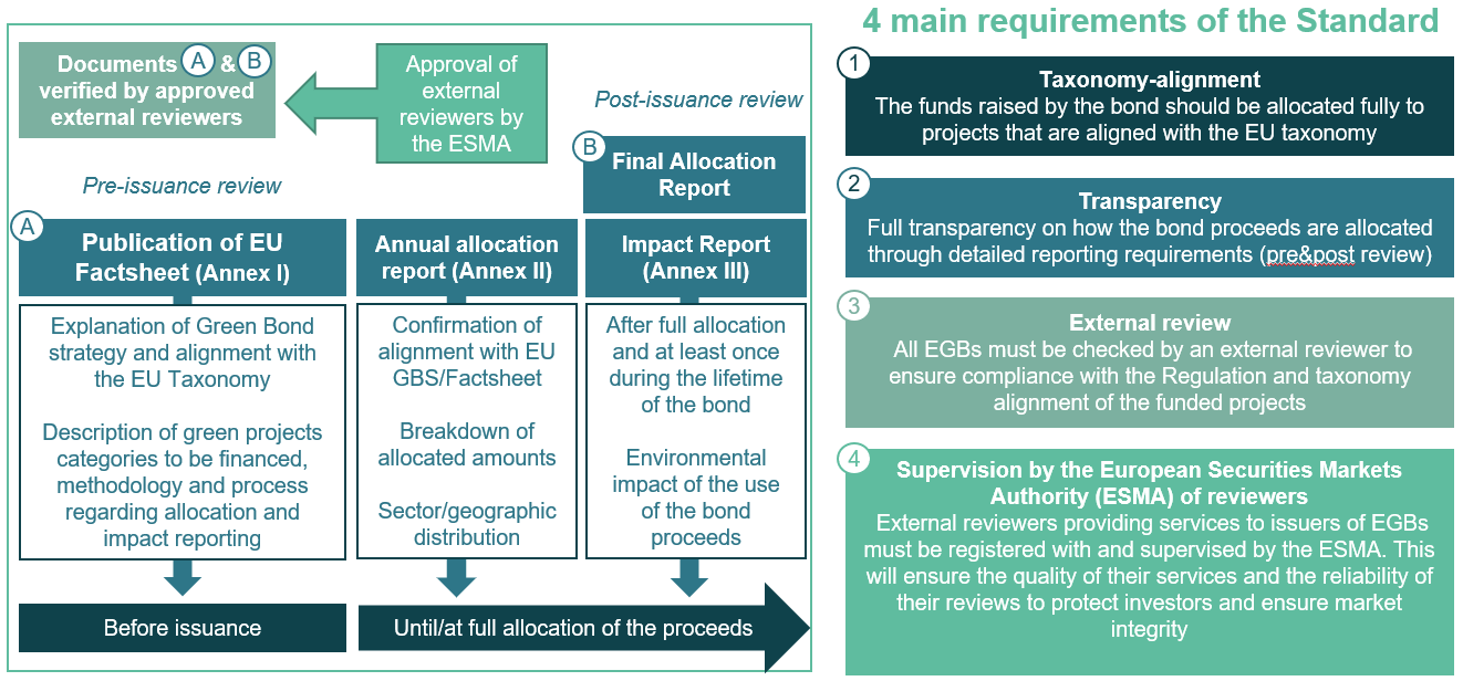 - Increasing transparency by creating a regime for the registration and supervision of external reviewers. European Green Bonds will be checked by an external reviewer to ensure that the bonds are compliant with the EUGBS Regulation, in particular the Taxonomy-alignment of the funded projects. External reviewers will be registered with the European Securities and Markets Authority (ESMA) and will need to meet the conditions for registration on an ongoing basis.