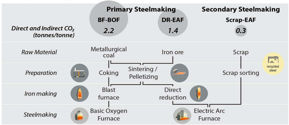 Primary steel production is considerably more carbon-intensive than secondary steel production (from scrap recovery or recycling), primarily due to the reliance on metallurgical coal for the reduction process (in both BF and coal-based DRI). The BF-BOF route involves using a blast furnace with coke to convert iron ore into molten pig iron and then using a basic oxygen furnace to convert that pig iron into steel.