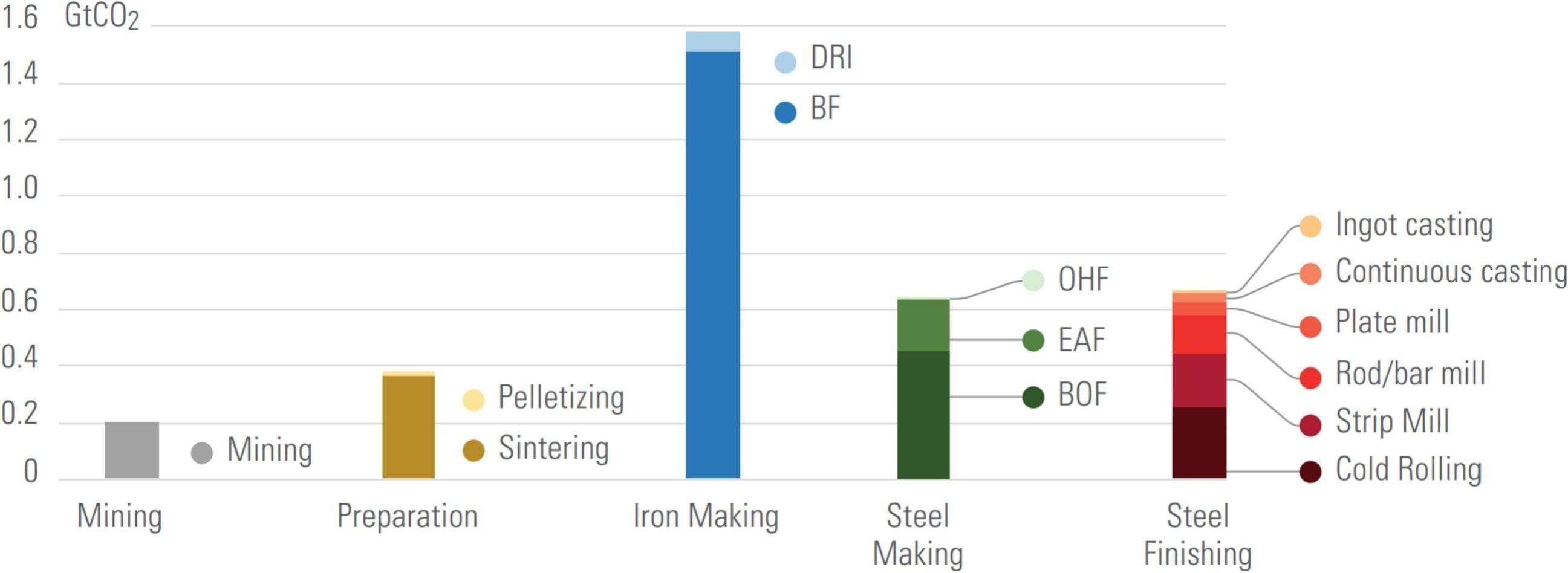 There are two predominant technologies in the industry today: conventional Blast Furnaces (BFs) and Direct Reduced Iron (DRI) technologies, which are respectively paired with Basic Oxygen Furnaces (BOFs) and Electric Arc Furnaces (EAFs), see figure 1 below for their respective emission intensity.
