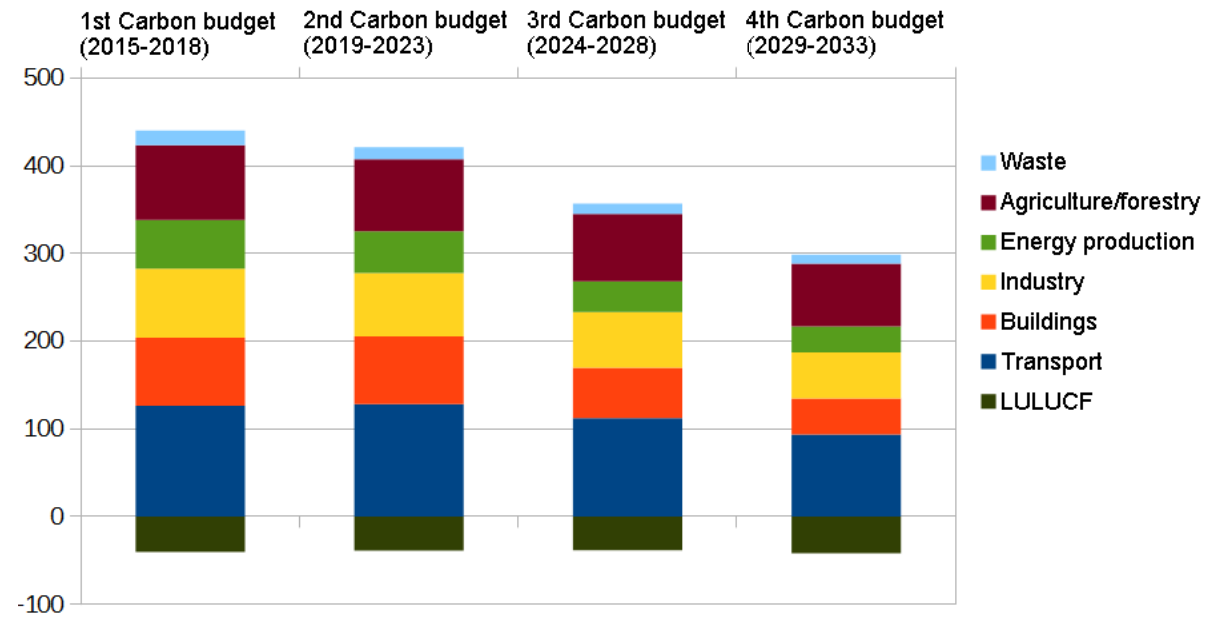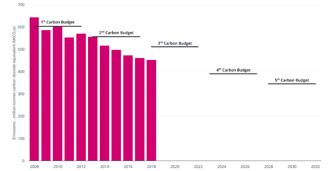 [10] The UK Climate Change Act 2008 requires the government to set five-yearly carbon budgets, running until 2032. The budgets are fixed in advance and set five-year caps on the total GHG emissions allowed to ensure the UK meets its emissions reductions commitments. The UK is on track to meet its third carbon budget (the current one, covering 2018–22) but does not seem to be on track to meet its fourth (2023–27) and fifth (2028–32).