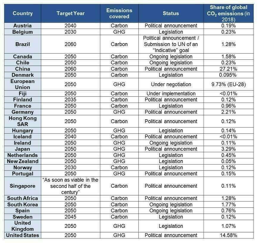 Table 1: National carbon or climate neutrality targets