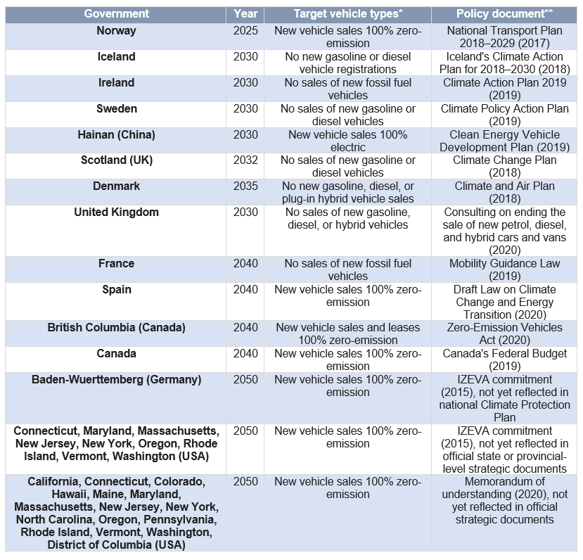 Other common measures to reach neutrality are bans on the sales of new internal combustion engines (ICE), at either the national, provincial, or city level. For instance Canada, Denmark, France, the State of Baden-Wuerttemberg in Germany, the province of Hainan in China, Iceland, Ireland, Norway, Spain, Sweden, the UK, and the 12 U.S. states that have adhered to California's Zero-Emission Vehicle (ZEV) Program have all set concrete targets to phase out sales of new ICEs. The deadlines are set up between 2025 and 2050 for these jurisdictions (see Table 2). Some of the largest vehicle markets such as the United States, China, or Germany have not yet officially announced plans to phase out combustion engines in passenger cars. However, Germany implicitly agreed to phase out combustion engine vehicles by 2050 by becoming a member of the Zero-Emission Vehicle Alliance (IZEVA), which brings jurisdictions to expand the ZEV market and work on ZEV policies and deployment. Meanwhile, China is already quite far ahead in terms of electrifying its bus fleet. Indeed, in 2019, 96% of new bus sales were electric vehicles in China.