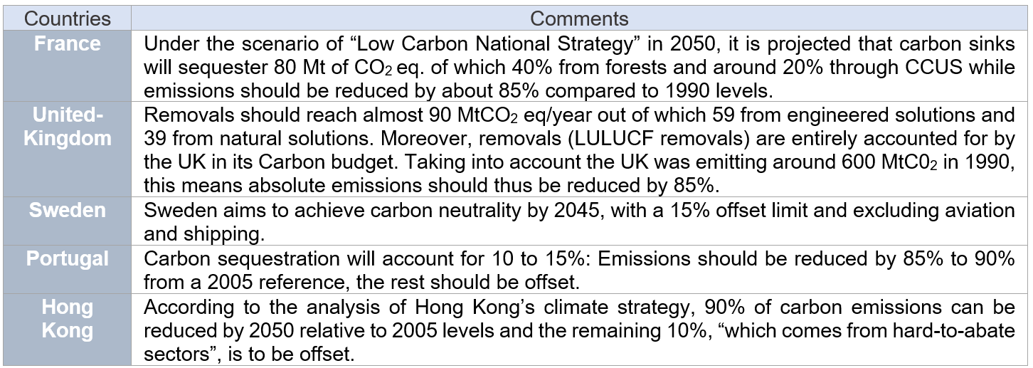 Most of countries’ NDCs explicitly refer to the contribution of removals from LULUCF but do not project the contribution of other removal technologies though they are more or less explicitly mentioned as means. A few countries (see table 3) explicitly refer to negative emissions and consider them necessary to offset agricultural emissions and other hard-to-abate sectors.